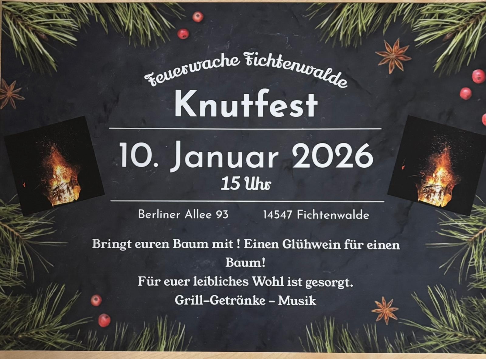 Wer nicht so lange warten möchte oder die Weihnachtszeit in geselliger Runde ausklingen lassen will, hat eine schöne Alternative: Am Samstag, den 10.01.2026 ab 15 Uhr lädt die Feuerwehr Fichtenwalde zum Knutfest ein. In der Berliner Allee 93, 14547 Fichtenwalde nehmen die Kamerad:innen der freiwilligen Feuerwehr eure Weihnachtsbäume gern entgegen – und bedanken sich mit einem warmen Getränk: Pro Baum gibt es einen kostenlosen Glühwein. Außerdem wird gegrillt und für Musik ist auch gesorgt.